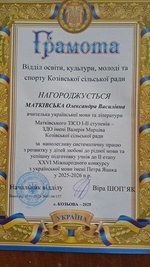 Вчителька української мови та літератури Матківська Олександра Василівна, нагороджена грамотою за успішну підготовку учнів до ІІ етапу ХХVІ Міжнародного конкурсу з української мови імені Петра Яцика.