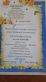 Учениця 9 класу Матківського ЗЗСО І-ІІ ст. ЗДО Марусяк Ангеліна, нагороджена грамотою та подарунковим сертифікатом за зайняте ІІІ місце у ХХVІ Міжнародному конкурсі з української мови імені Петра Яцика.